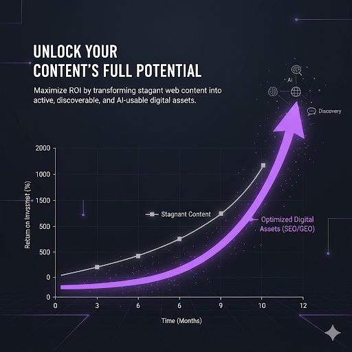 Maximize your return on investment by transforming stagnant content into active digital assets. Our SEO and GEO services eliminate technical barriers, ensuring your website is discoverable, readable, understandable, and usable by AI chatbots and LLMs. By leveraging semantic markup, we ensure generative engines prioritize your information, squeezing every bit of value from your content.